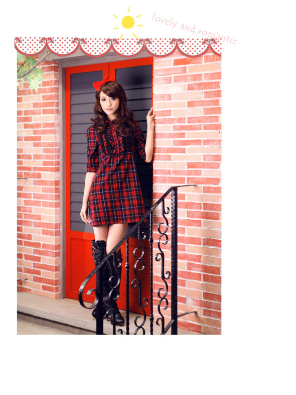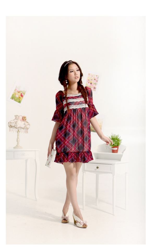红色格纹黑色蕾丝装饰小A字连衣裙