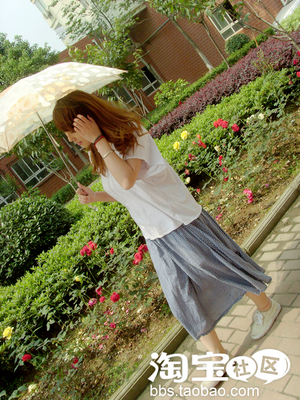 (3) 白色蝙蝠袖大T+复古水玉点蓝裙