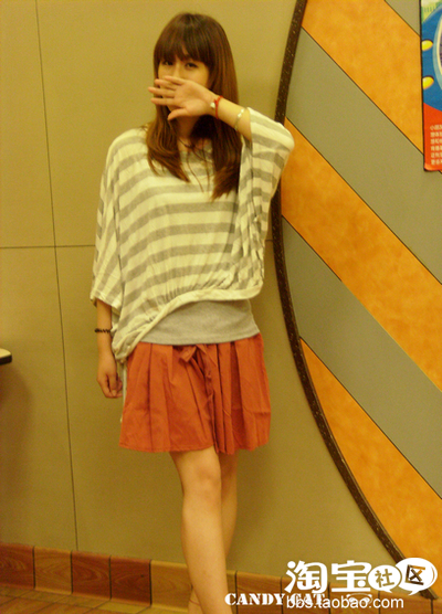 (5)蝙蝠条纹衫+亮色短裙