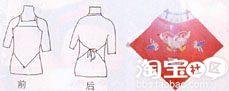 清代“抹胸”又称“肚兜”,一般做成菱形。上有带,穿时套在颈间,腰部另有两条带子束在背后,下面呈倒三角形,遮过肚脐,达到小腹。材质以棉、丝绸居多。系束用的带子并不局限于绳,富贵之家多用金链,中等之家多用银链、铜链,小家碧玉则用红色丝绢。“肚兜”上有各类精美的刺绣。红色为“肚兜”常见的颜色。