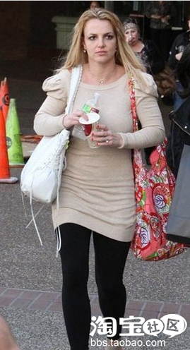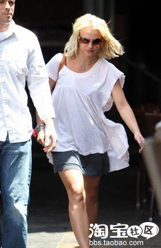 衣服的尺寸,绝对不能包在身上,这样绝对显胖。穿过于肥大的衣服则让整个人看上去像一个大大的口袋,略微宽松是最好的选择。布兰妮却将这两种极限都穿上了,松垮的软软的白T恤,邋遢又无型;紧身的露点T恤将腰部的赘肉显露出来。