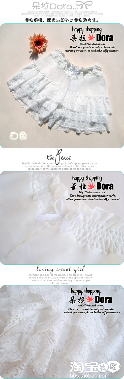 这件打底的可爱裤裤是层层的蛋糕蕾丝呢~~所以很可爱的,很女人的,露出一个小边也很不错丫?~~~夏天炎热,所以再穿一件打底裤貌似更加不透气~~~所以在材质上一定要好的品质哦,特别是穿在私密的部位~~这点很重要呢~~~这款裤裤不像网上其他的仿货,有用棉布,有用泳布。我也看到有的十分通透也是蕾丝,(我是想蕾丝似乎太通透啦~~个人看法啦~)这款裤裤用的是冰蚕丝~~so~~~凉爽亲肤的感觉可想而知啦~~~有黑白两个颜色~~~~好了,上图吧~~
