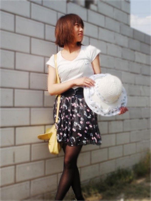白色字母T恤+樱桃短裙+黑色心形点缀皮带 简单甜美的小女生,略微带点小俏皮