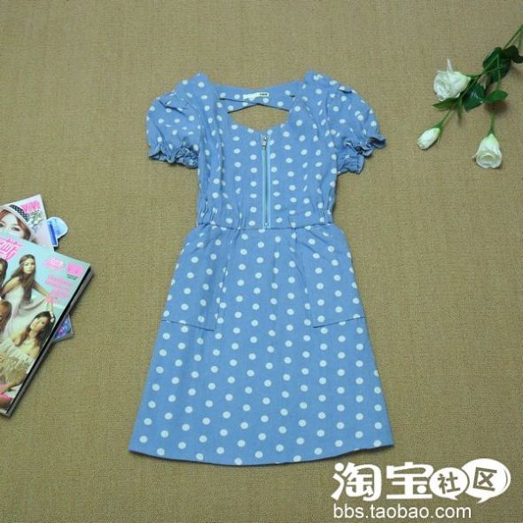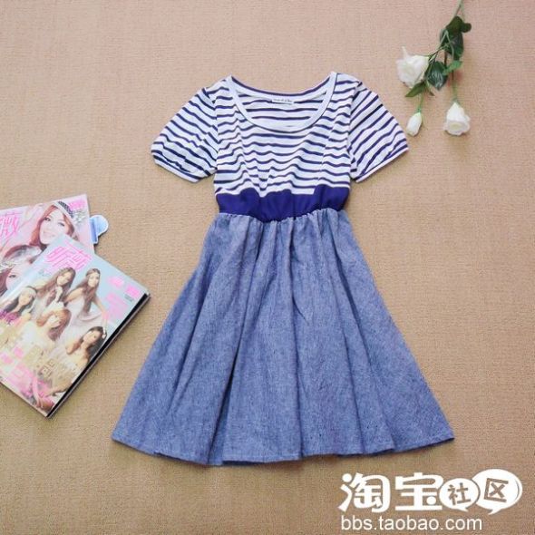 上面是纯棉的条纹下面是圆点稍簿的牛仔布裙不算长,