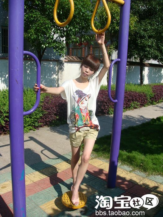 9. 摩登女郎图T恤+米色薄牛仔短裤+藤条腰带