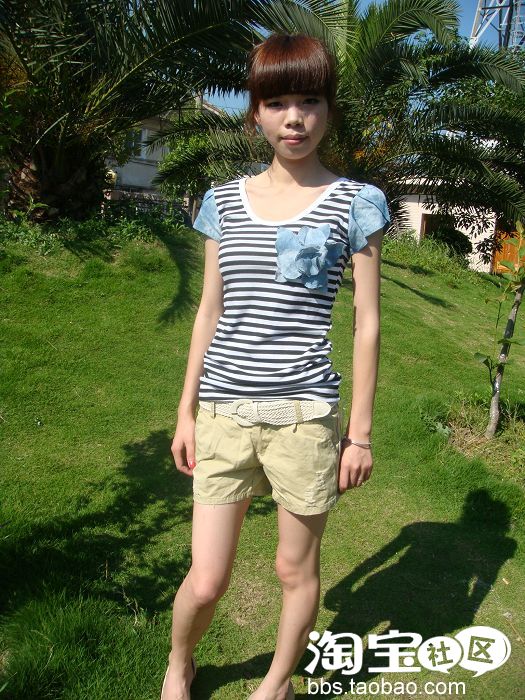 8.牛仔花朵条纹T恤+米色薄牛仔短裤+藤条腰带