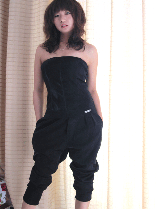 很喜欢的连身裤,而且有多种穿法哦,长裤,九分七分随意拉就OK啦!厉害吧!因为裤脚处有一个隐藏的拉链啊,哈哈!后背有两根带子,可以结成漂亮的蝴蝶结,身材马上就显出来了,酷又不失甜美,杨杨超爱的。而且颜色是有光泽感的得的那种黑,不是死气沉沉很闷的那种的, 很有感觉,马上穿着跟男友炫耀啦!