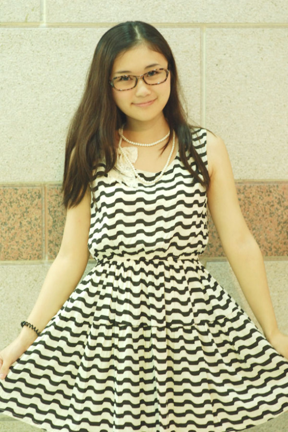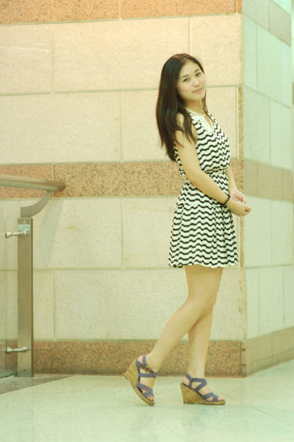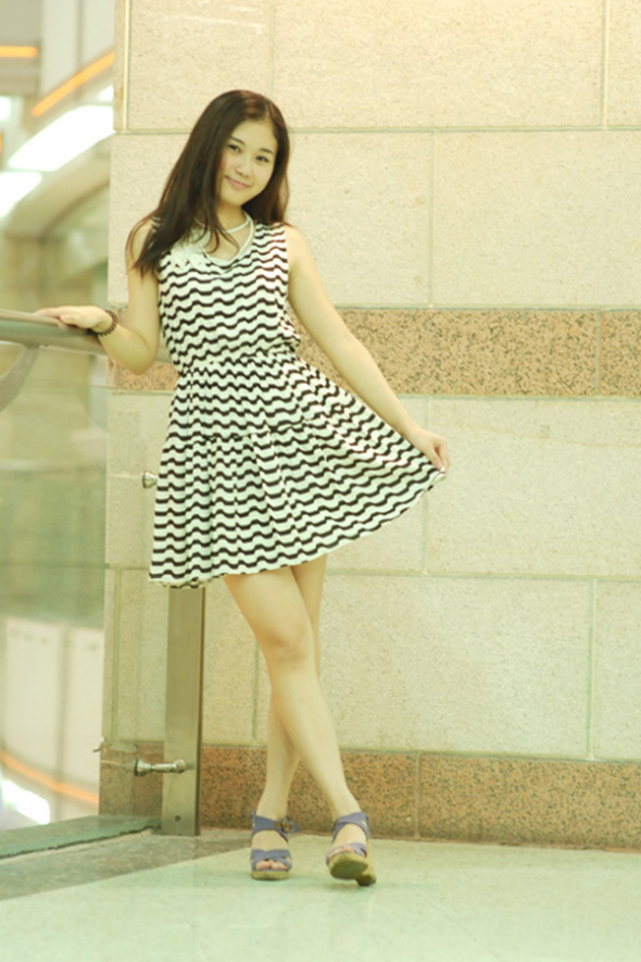 2.黑白波纹赫本风无袖连衣裙+珍珠项链