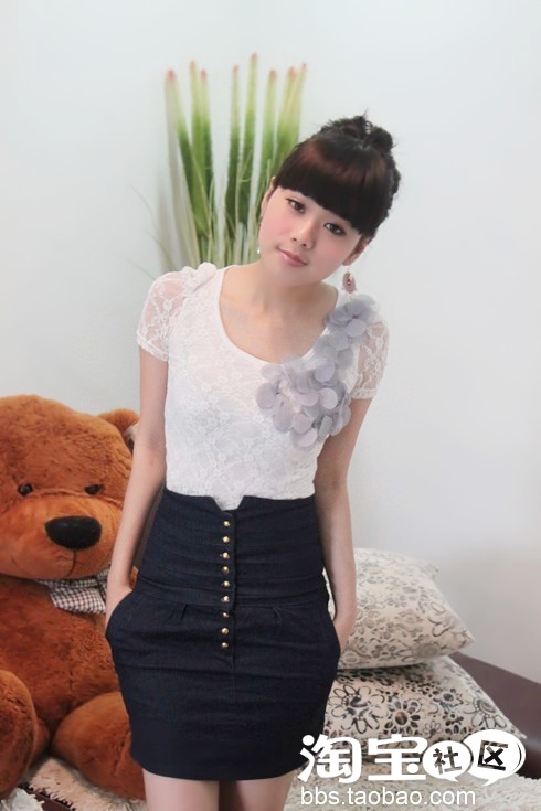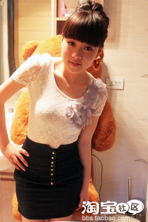 小星的第二款百搭秀:泡泡袖 蕾丝纱圆领 T恤+包臀高腰裙