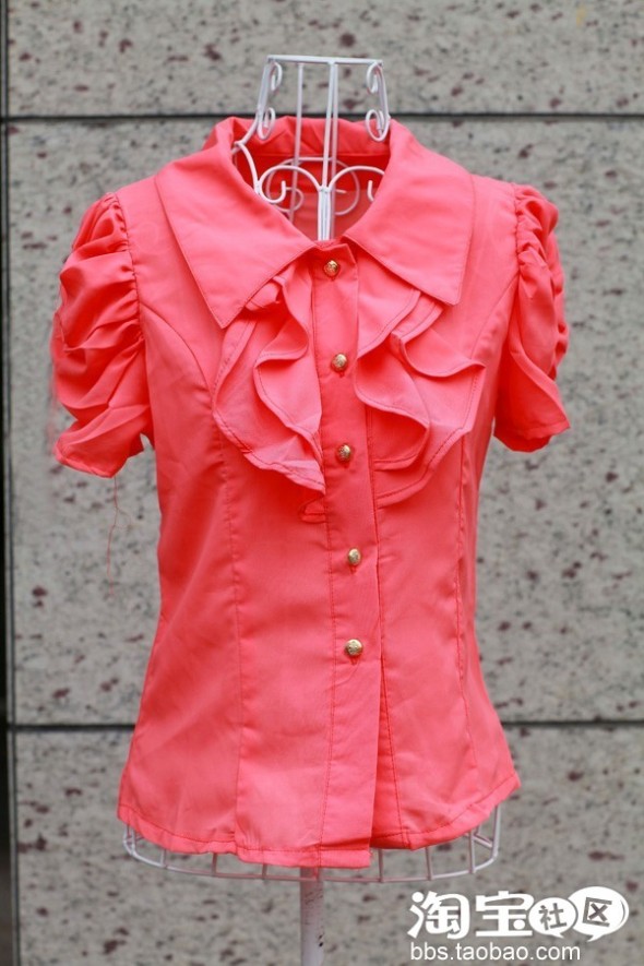 2010夏季时尚韩版西瓜红翻领泡泡袖短袖衬衣