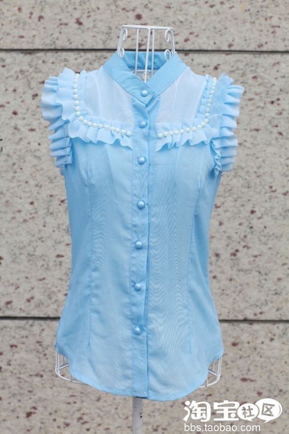 2010夏季时尚韩版蓝色 珍珠打摺无袖衬衣