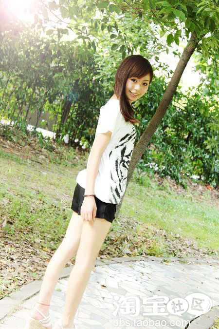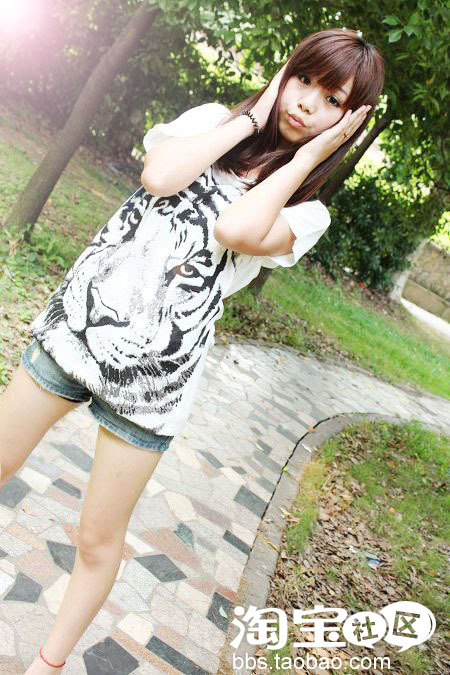黑色的蝴蝶结短裤加上白色的高跟鞋,跟老虎T上的黑白搭配的刚刚好!这样穿是最安全的方法拉
