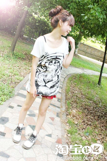 这样的老虎时而野性时而俏皮,老虎T加上有朋克感觉的红格短裤,