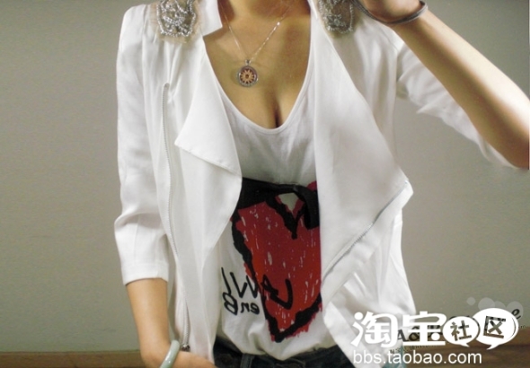 喜欢看韩剧的MM应该有发现现在特别流行垫肩的和有肩章的YY,如果你也有想尝试一下的想法,那可要仔细看看下面这两件哦,都有一点小垫肩,特别能凸显气质,肩膀上都有亮亮点缀,都是手工的哦,不管你想是可爱还是想干练这两款你都可以选择一下,有点胖胖的女孩可能不太敢选择白色的衣服,但是这两款衣服可能和面料有关系特别的显瘦,里面不同的搭配可以穿出不同的风格和效果哦~!