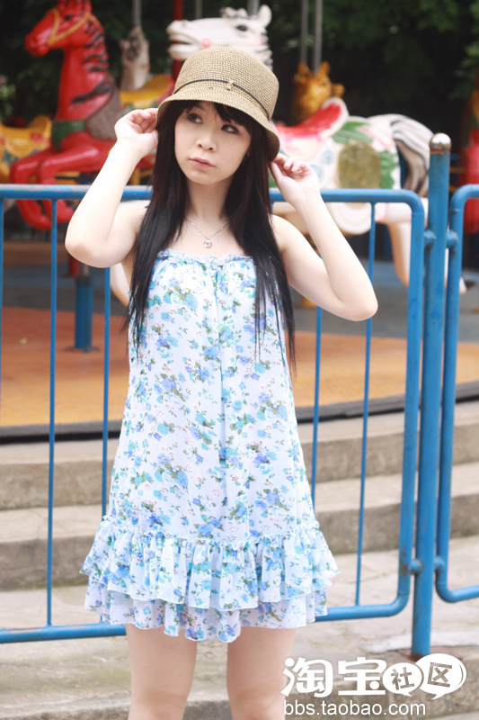 NO4:蓝色碎花吊带裙+个性小草帽