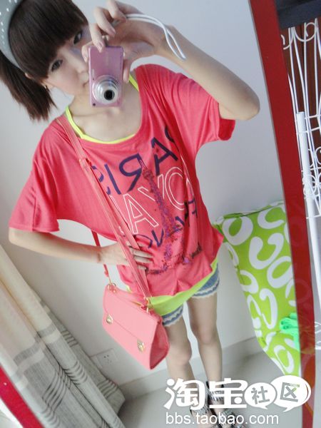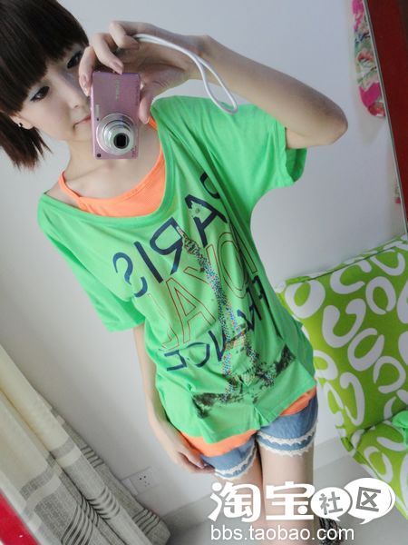 绿色T+橙色背心,同样的搭配,因为颜色的不同却有不同的感觉