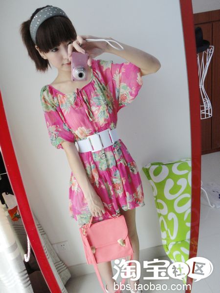 玫红糖果色+白色腰带,整条裙子就亮好多喔