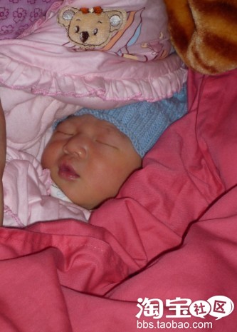 发张刚生时戴我织的小帽子照。刚生下来第二天。没开闪光灯。其实他蛮白的。。哈哈。真臭屁。`~