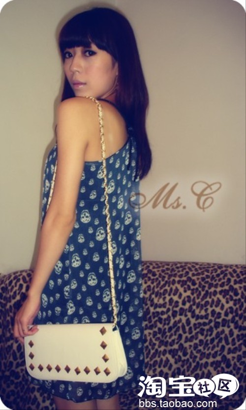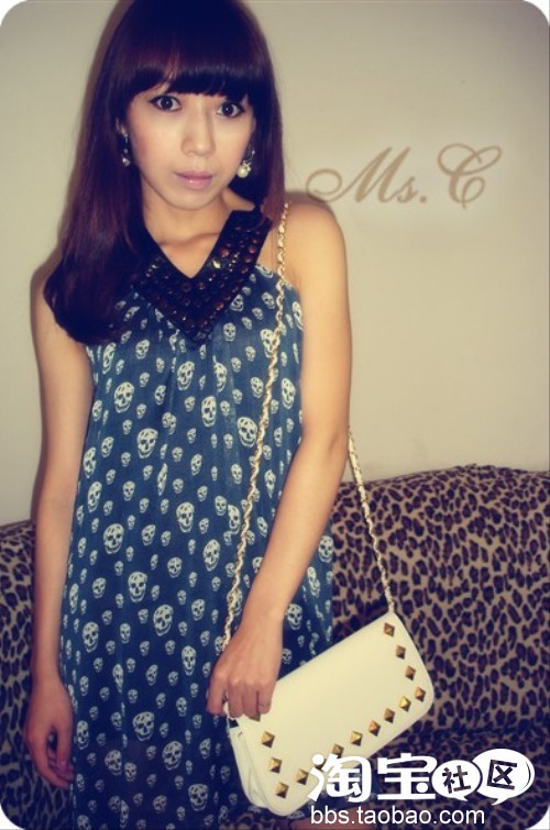 深蓝色雪纺骷髅铆钉连衣裙+白色铆钉长挎包