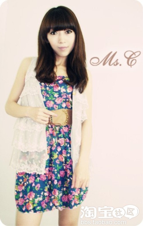 VIVI花柄吊带裙+棕色铆钉腰带+白色蕾丝马甲