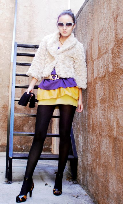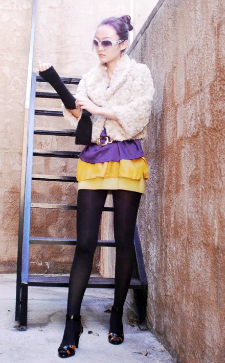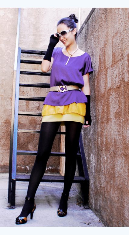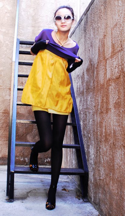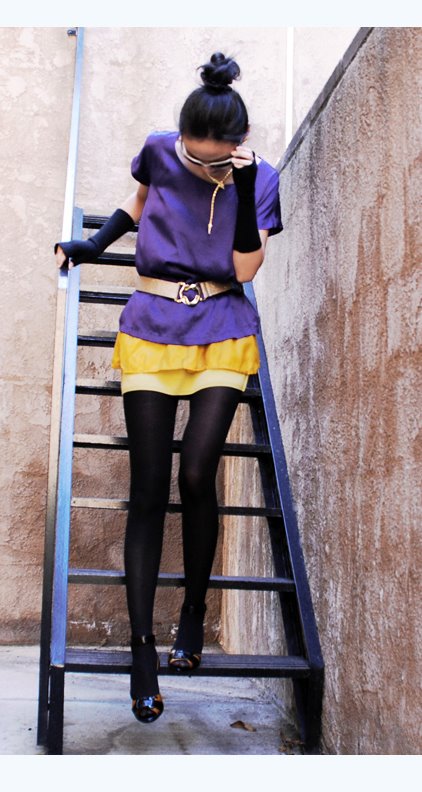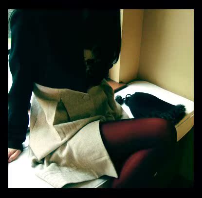 妈妈羊毛裙子我反穿后加了紫色的丝质上衣,一条腰带,搞定!