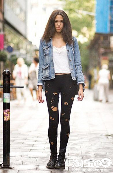 疯狂的破洞还不仅在牛仔裤上,现在甚至连女人的长袜都被传染了硬生生要挖出几个破洞来。(不过破袜子特别是破丝袜不是潮人估计难以接受虽然在我们这的街头破袜的身影还比较少见但在上海和香港已经可以常常看到。以前打底裤刚流行的时候,一般人开始还不是很习惯。