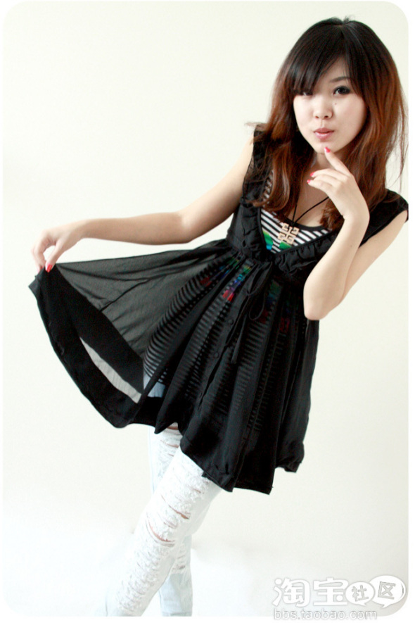 NO.1 黑色雪纺吊带裙+条纹背心+破洞牛仔裤