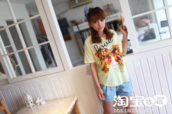 淡淡黄色透气性非常好的休闲T,自在的上身,胸前彩绘感很强的缤纷水果