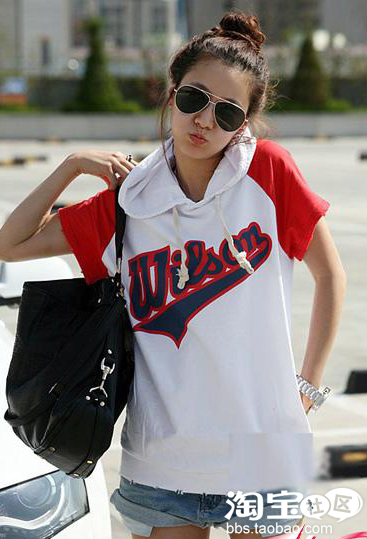 连帽拼色短袖T,红色总是这么显眼