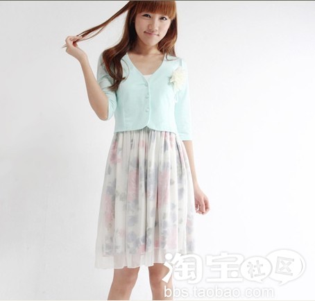 花朵吊帶裙+开衫两件套 送胸花 蓝色