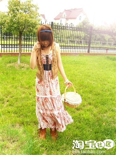 NO.2 真丝碎花大摆波西米亚风长吊带裙 +修身牛仔马甲背心+罗马坡跟凉鞋