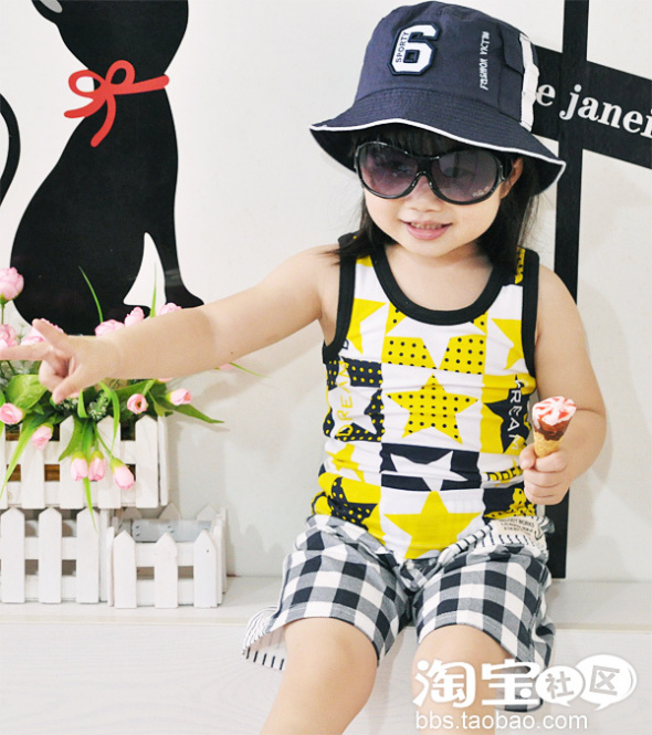 渔夫帽,加上星星印花的亮色背心,还有黑白格子中裤,打造休闲度假小公主
