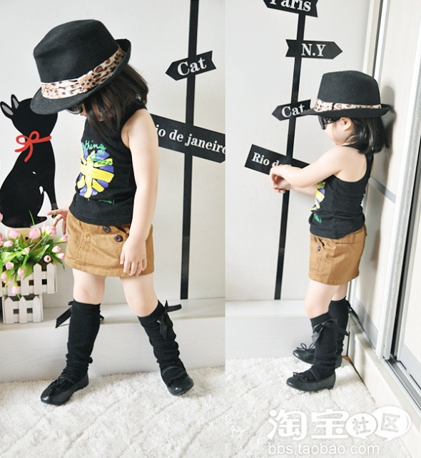 黑色爵士帽+黑色工字背心+咖啡牛仔短裙+黑色蝴蝶结中筒袜,打造气质小公主