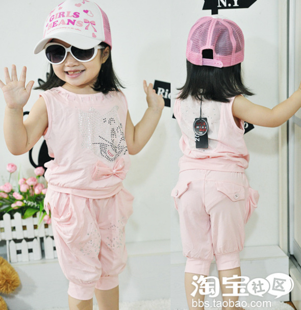 粉色棒球帽+粉色背心哈伦裤套装,打造健康运动小公主