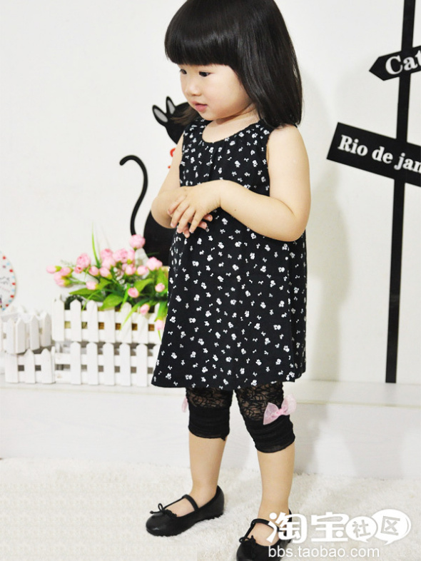 黑色小碎花的背心裙+黑色镂空打底裤+黑色小皮鞋,打造优雅小公主