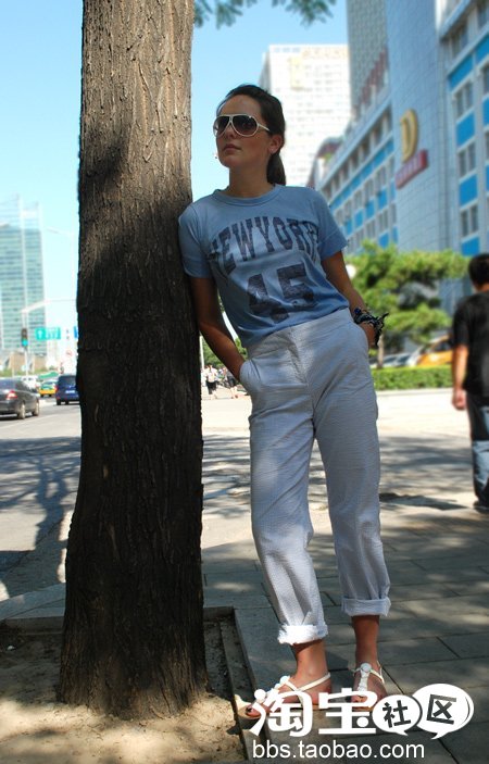 一身浅色的休闲,加上罗马风格的凉鞋,是这一年的趋势喔~~