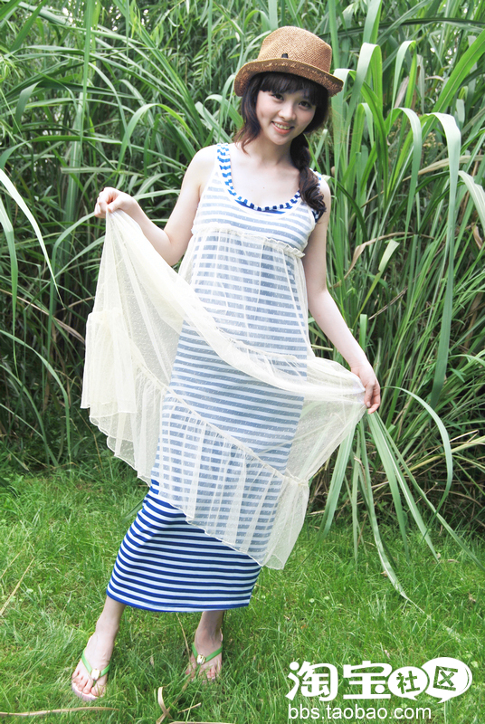 夏季怎能少了长裙?这款长裙是两件套,里面是海军风的条纹长T裙,搭配吊带纱长裙