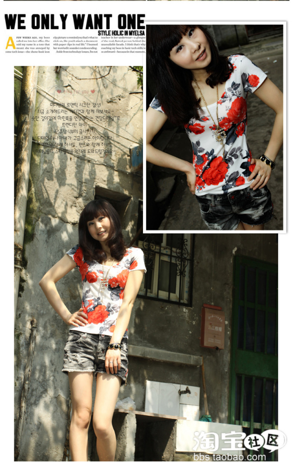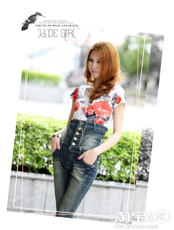 一, 颜色,请大家仔细看就不难发现,牛仔裤的颜色和衣服上牡丹的叶子的颜色雷同,这就造成了整体效果死气沉沉,没有跳跃感,没有亮点,如果换成一条浅蓝色的牛仔短裤,马上就不一样了哟