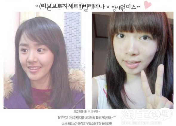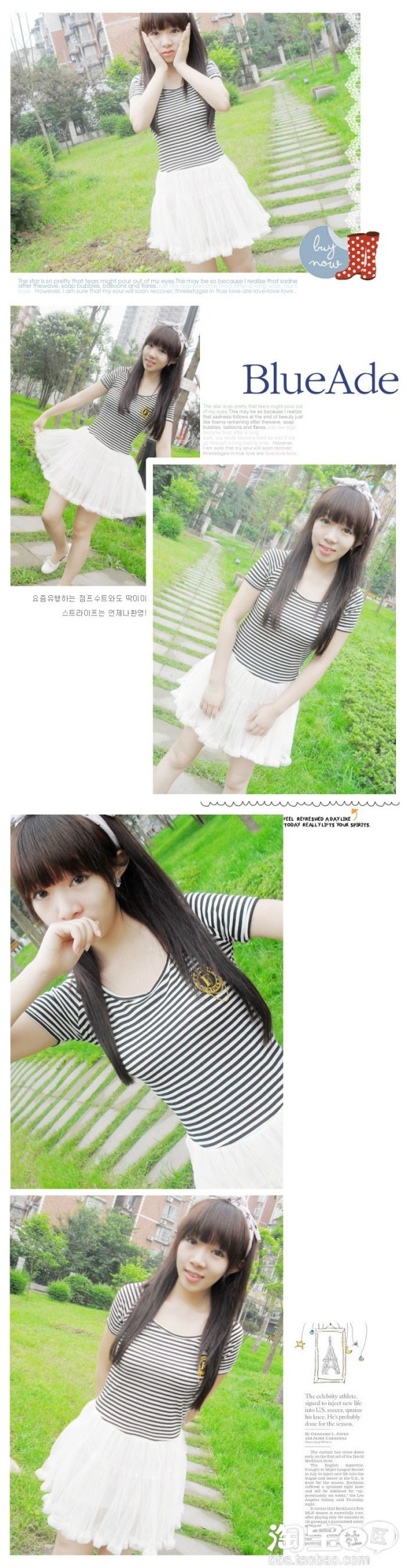韩味十足的发带+白色蕾丝拼贴粉红连衣裙