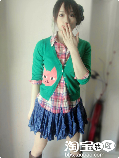 红色格子衬衫×绿色小开衫×蓝色百搭裙
