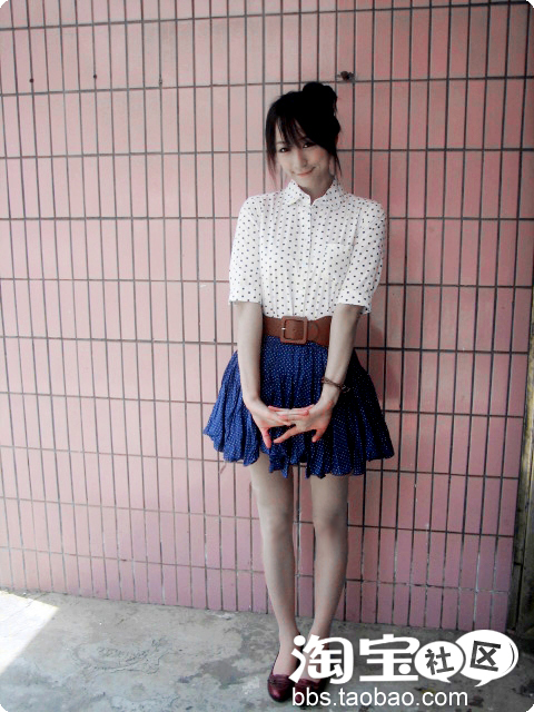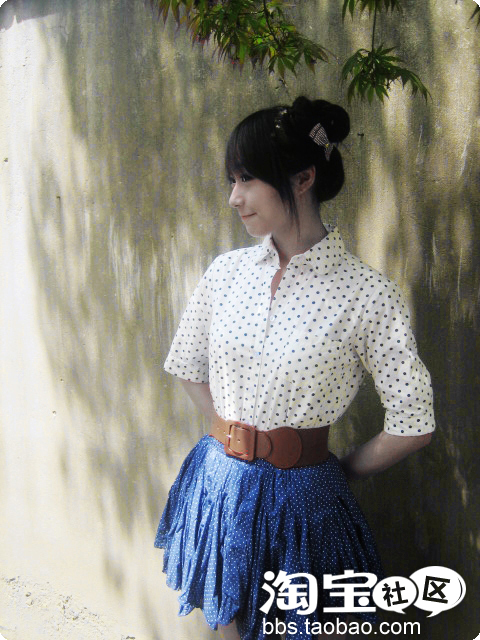 长款的白色点点衬衫乖乖地躲在蓝底点点的百搭裙底下