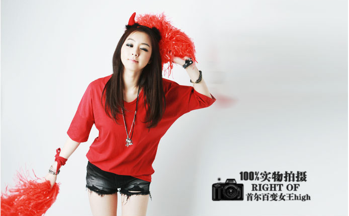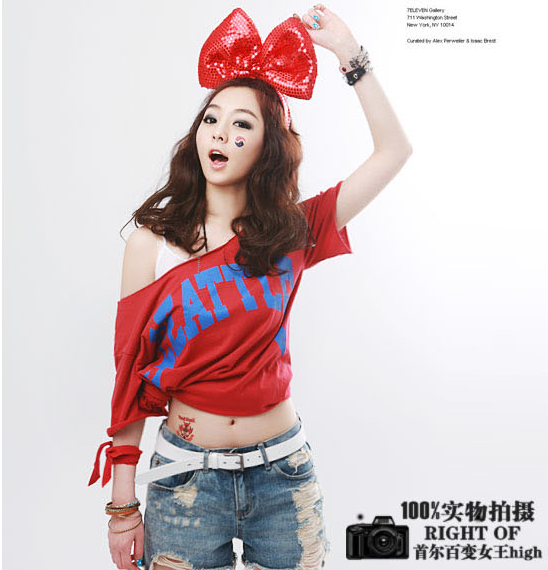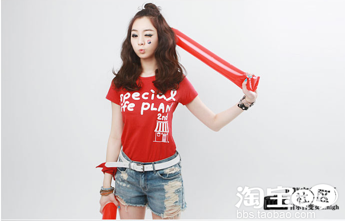 呵呵,因为世界杯就要到了,所以啦这款特适合拉拉队了啦!领子很大 吼吼,露出漂亮肩肩!YY很长,就把它卷起来,谁说T恤不能秀身材?