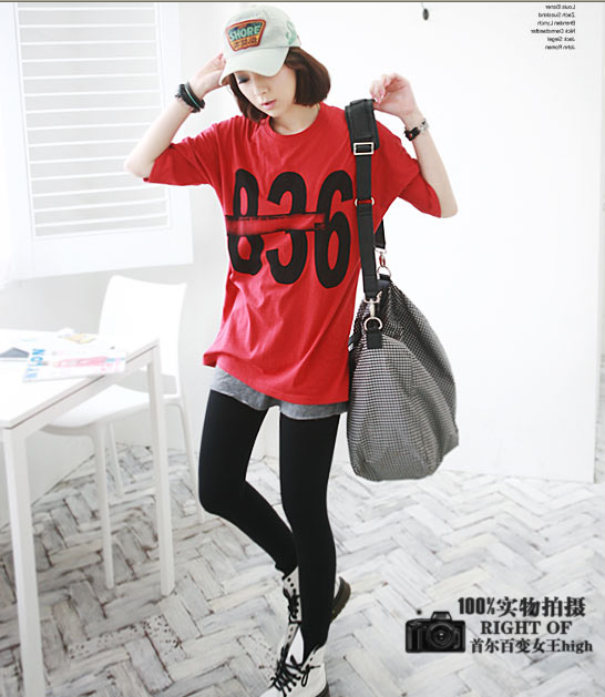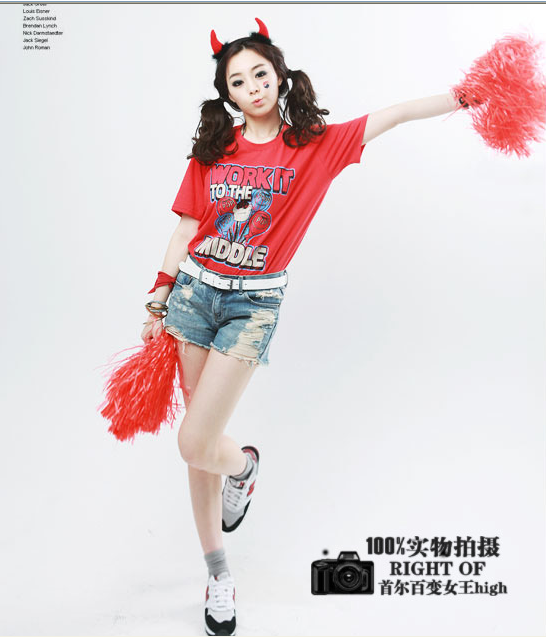 这个T恤就是V领,小修身不大不小的设计,但是因为衣服映着黄色向日葵的图案,和衣服的红色很相称,所以就很有味道!建议MM们穿这样不大不小的T恤可以这样穿哦!把T恤卡到短裤里,吼吼,这样能不让自己看起来胖!因为一般小领口T恤都会让上围比较丰满的MM看起来有点胖,有点壮,这样穿,会缩小上身的视觉感!