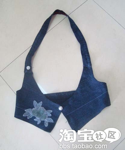 花朵是原来旧三角巾上拆下来的 然后一针一线缝制的,纽扣是原来的旧西服上剪下来的,吊脖部分是裤腰那里,你可以用专门的拆线器好像5毛一个吧 一分钟不到就可以拆下来了。其余就是裤腿哪里根据自己穿的型号设计一下,就可以裁剪出来了。最后,家里没有缝纫机的可以拿到外面缝制一圈 2元钱,就这样搞定了,穿在T恤外面很不错!