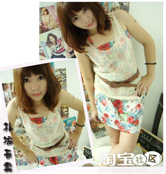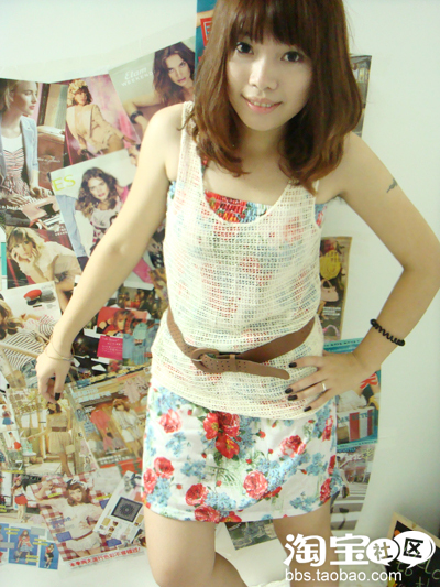 挂脖碎花抹胸长裙+ 网T外套 百搭又不用多花钱,嘿嘿~~
