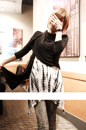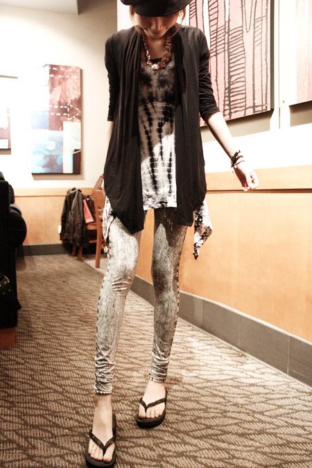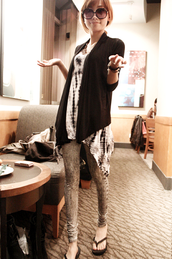2.超基本款莫代尔棉黑色开衫+扎染T+牛仔纹打底裤+短靴