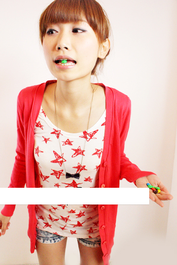 3.COLOUR开衫+星星涂鸦T+短裤+球鞋
