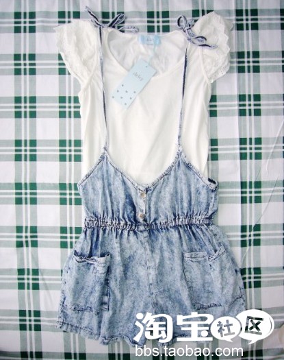 我就用这件欧美水洗牛仔单宁布背带裤搭配VIV款纯白蕾丝小飞袖T恤打底。