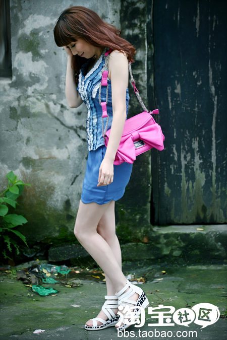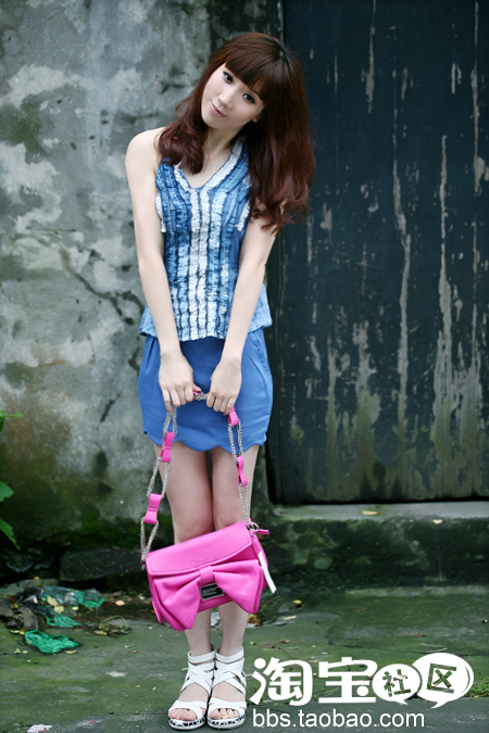 LOOK 1 木耳边渲染色绑带牛仔背心+蓝色花苞裙