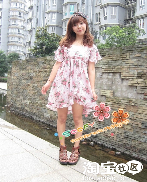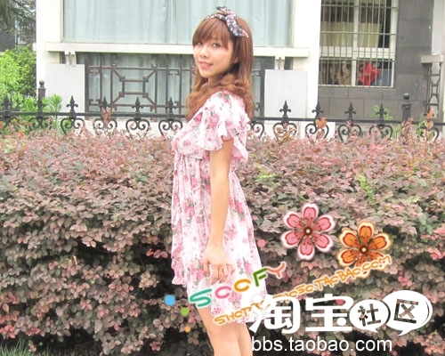个人是蛮喜欢雪纺滴,因为料子穿起来蛮舒服,而且不热~透气性不错,这款精致甜美的花柄洋装展现出小女人的柔美风情,腰部的抓褶呈现诱人曲线,带着微甜的气息,开叉的荷叶边袖子和裙摆,飘逸轻柔的材质穿起来相当舒适~我收集了两种颜色供大家选择噢,除了米色以外还有粉色哦,而且本款还有大号的YY,所以不用担心呐~~